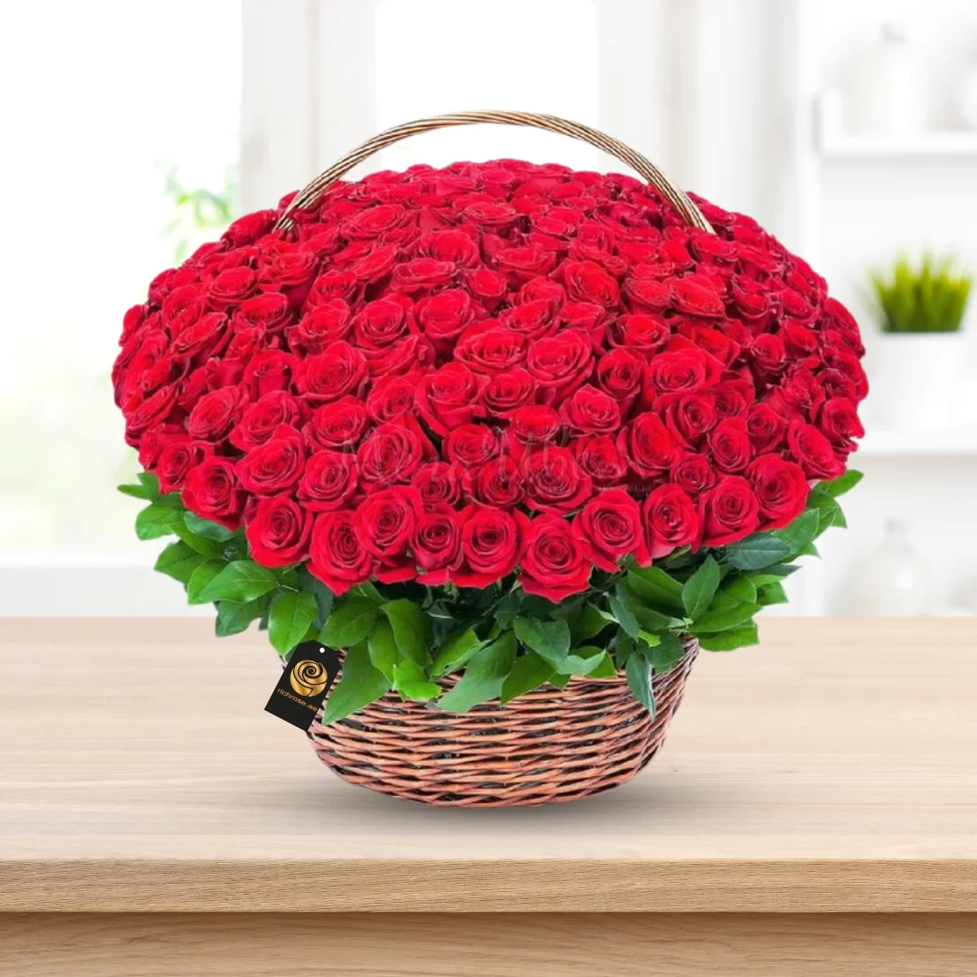 Stunning rose basket with 70–120 blooms from our flower shop. Fast online flower delivery in Dubai & Sharjah. Order now for same-day delivery!