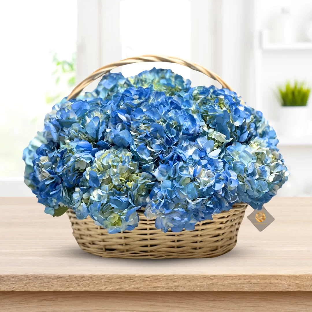 A breathtaking arrangement of vibrant blue hydrangeas, beautifully presented in a classic woven basket. Perfect for adding a touch of elegance to any space or as a heartfelt gift for special occasions.