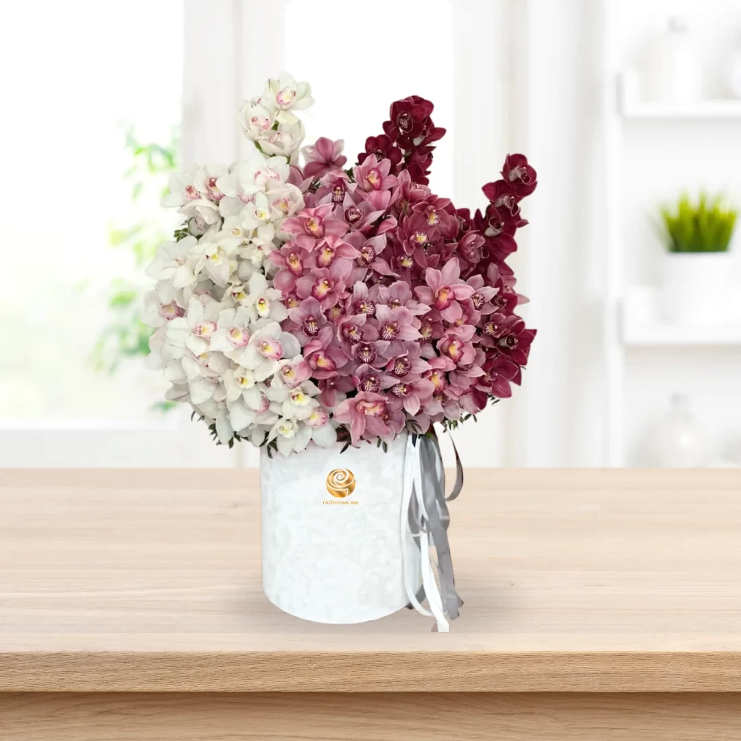 Elevate your décor with this sophisticated blend of white, pink, and burgundy orchids artfully arranged in a sleek white vase. Crafted to bring lasting beauty without maintenance, this lifelike display is perfect for adding an elegant touch to any home or event