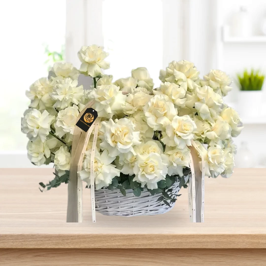 A luxurious arrangement of pristine white roses elegantly placed in a charming woven basket. Get well soon ,Ideal for weddings, sympathy gestures, or celebrating pure love. Order online for same-day delivery in Dubai!