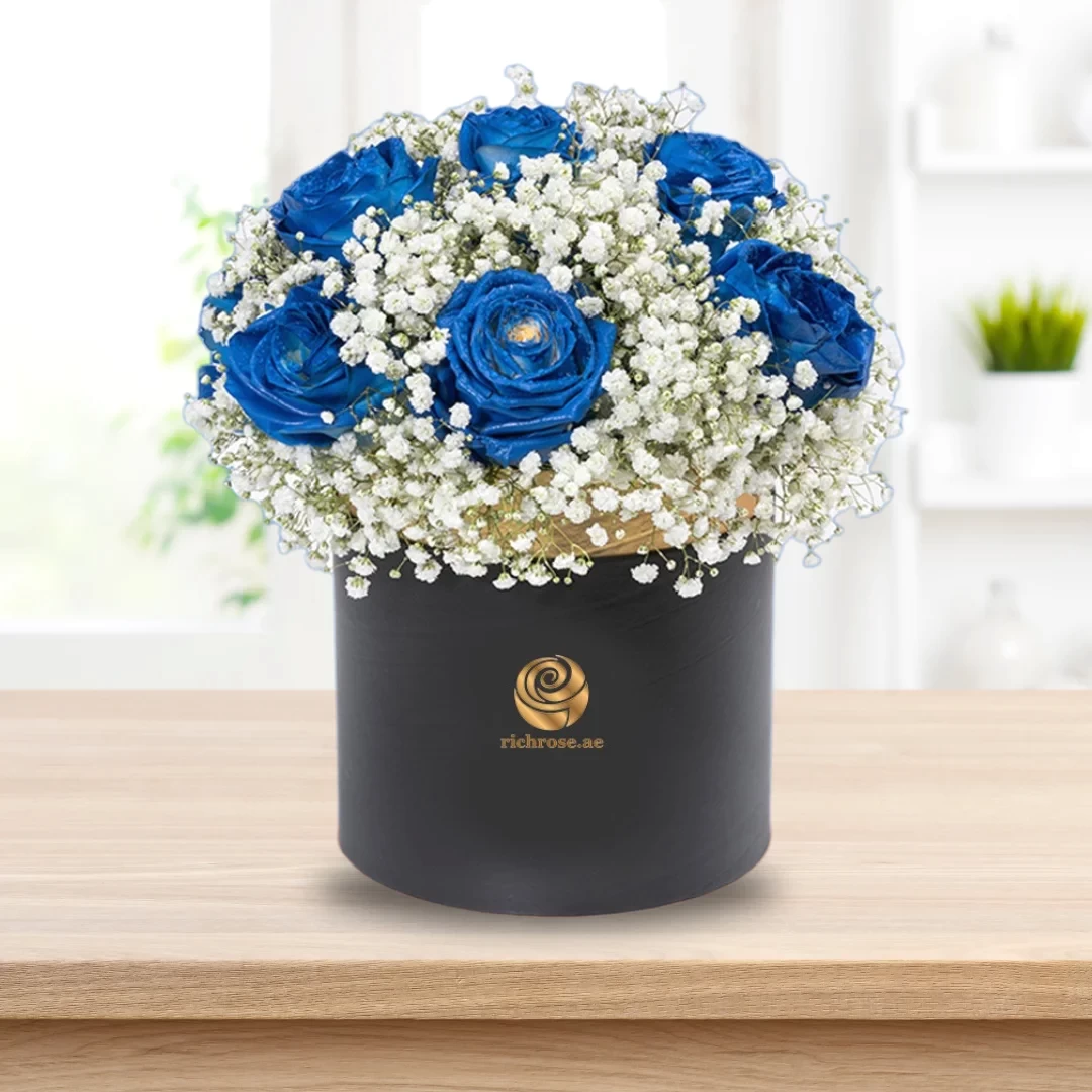 Elegance meets bold beauty in this luxurious arrangement of deep blue roses surrounded by delicate white baby’s breath, elegantly presented in our signature black hatbox. A striking gift perfect for special celebrations, anniversaries, or to express your most unique sentiments.