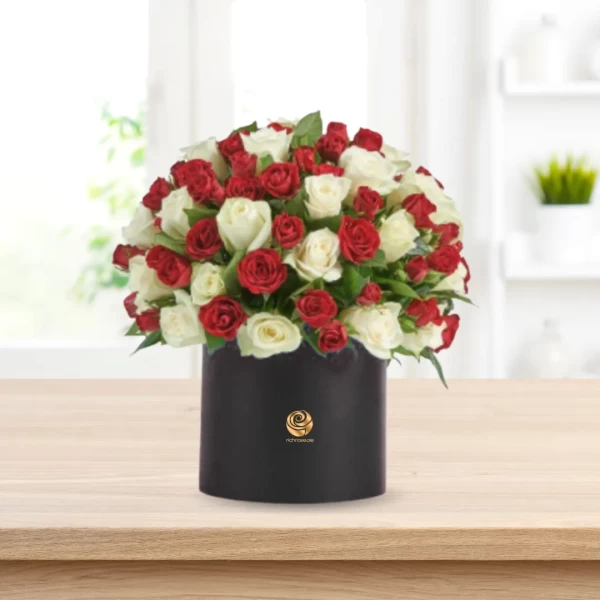 A classic red and white rose combination in a stylish box.