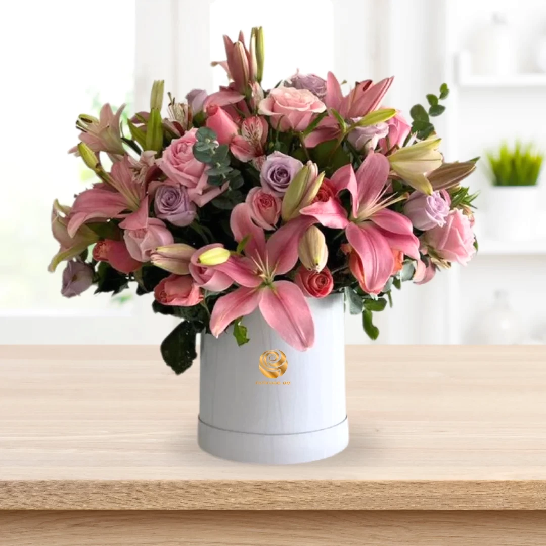 A breathtaking arrangement of pink lilies, roses, and delicate blooms, elegantly presented in a chic white box. This stunning floral masterpiece exudes elegance and romance, making it the perfect gift for any special occasion