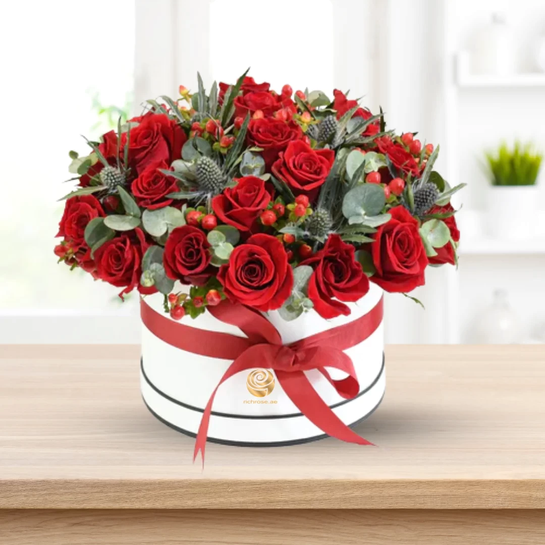 25 RED ROSES, 5 STEM ERINGYUM 7 STEM RED BERY IN WHITE BOX