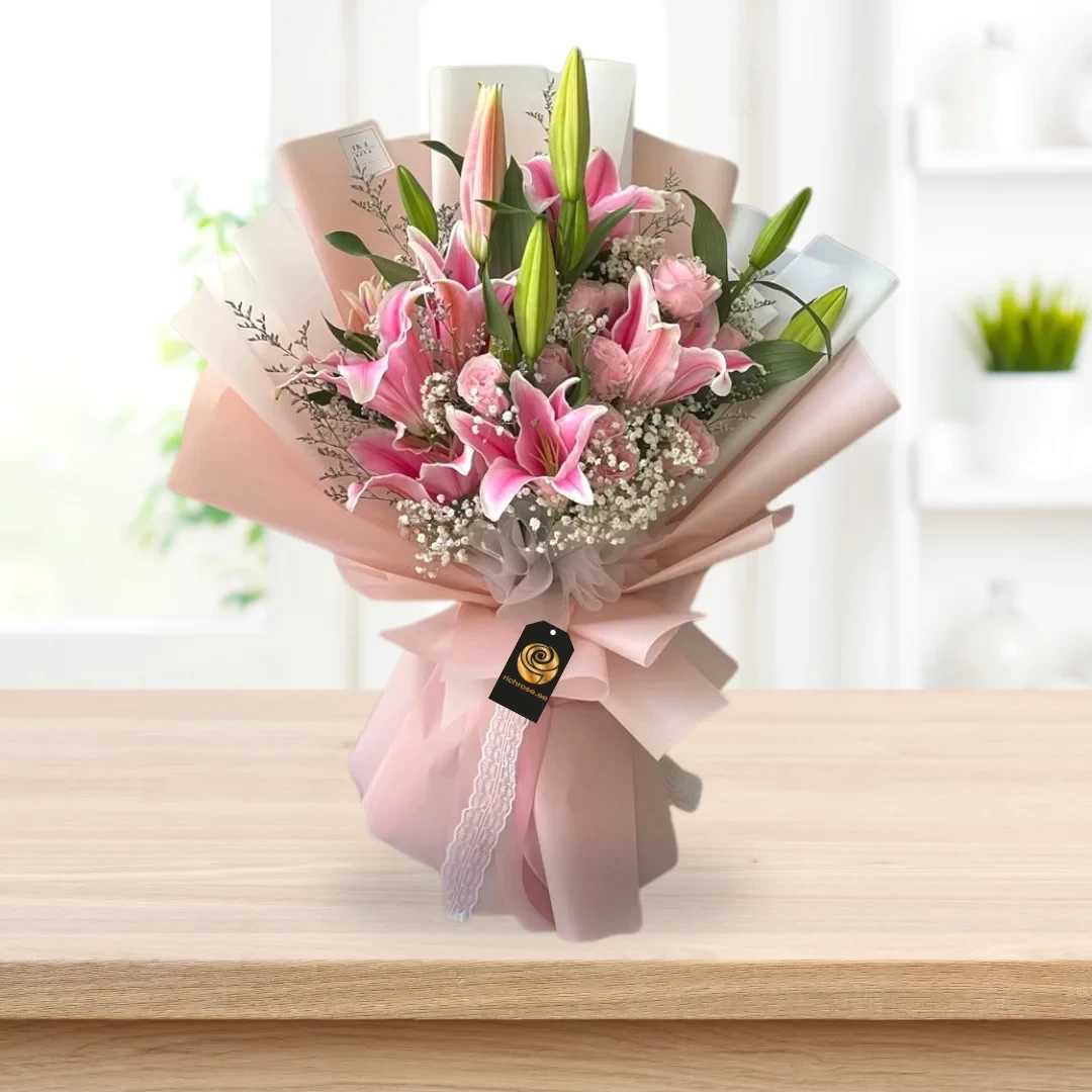 A graceful arrangement of pink lilies, roses, and delicate baby’s breath, wrapped in soft pastel tones for a romantic and sophisticated touch. Perfect for birthdays, anniversaries, and heartfelt gestures.