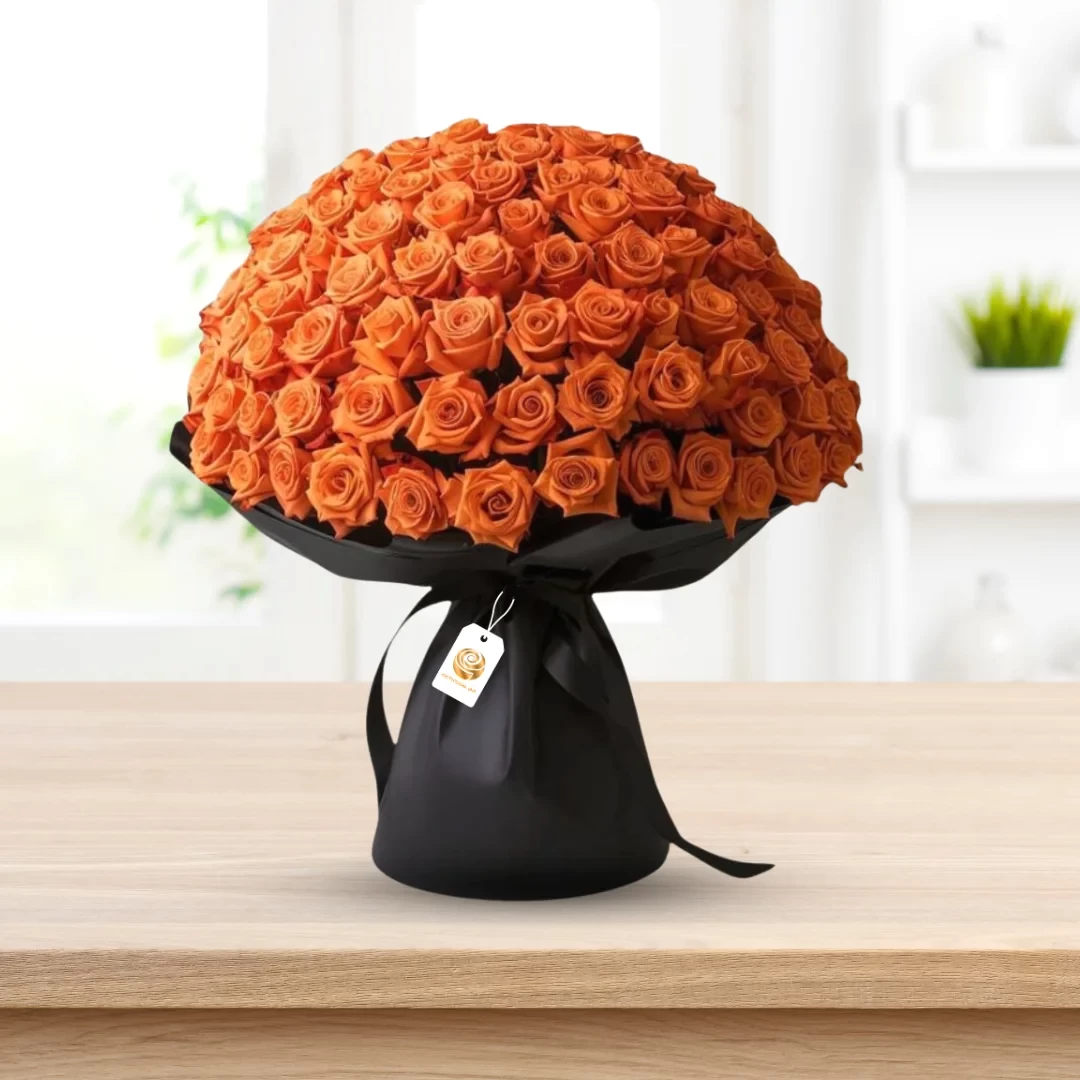 ♦ 100 ORANGE ROSES WITH BLACK WRAPPING