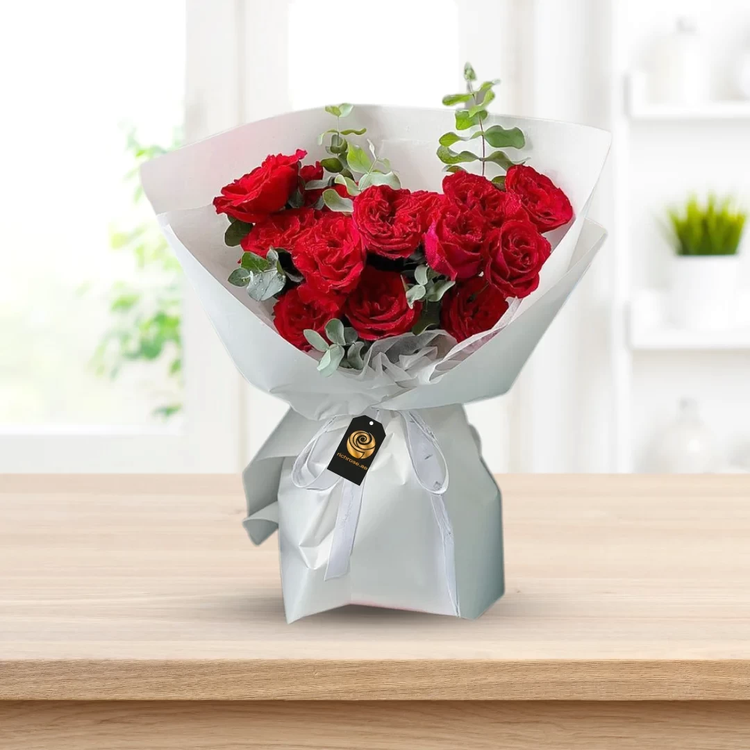 A timeless bouquet of fresh red roses, beautifully complemented by lush eucalyptus leaves and wrapped in a sophisticated white presentation. Perfect for romantic gestures, anniversaries, and heartfelt expressions of love.