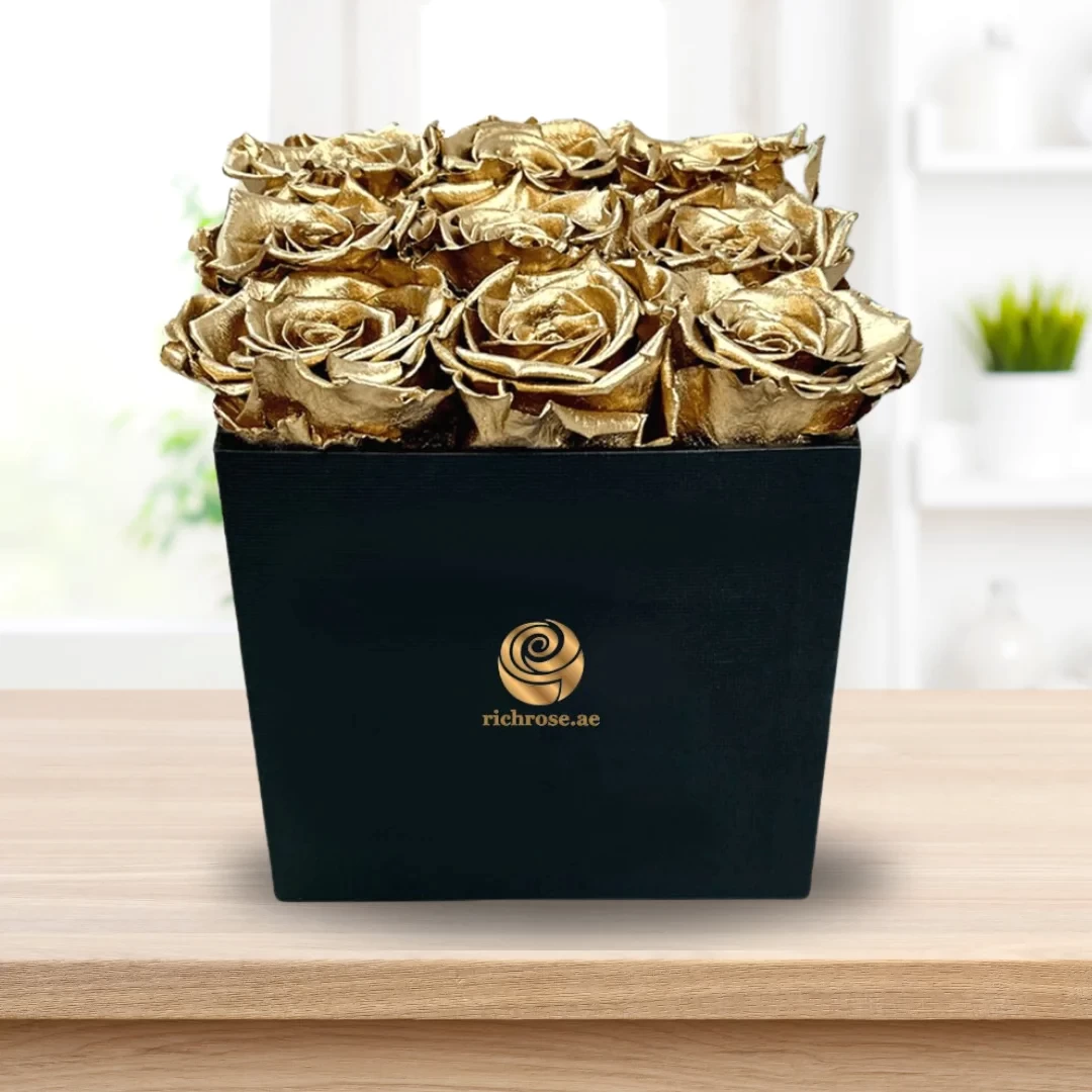 A luxurious and eye-catching gift, these stunning golden-painted roses are carefully arranged in a sleek square box. The metallic, sunshine-hued blooms exude opulence and sophistication, making them a perfect gesture for expressing admiration, gratitude, and extravagant love.