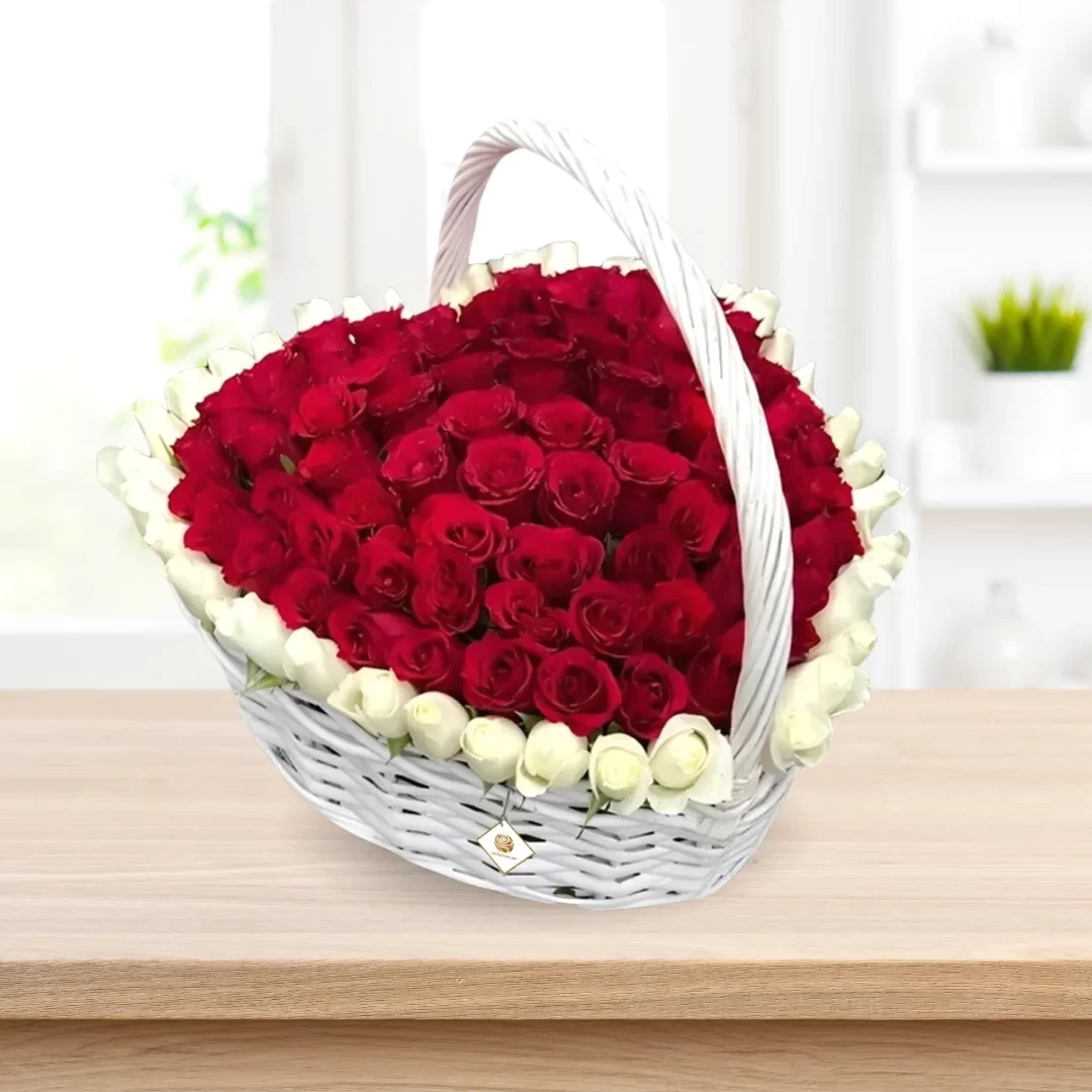 Lucky Roses -  Red and White Roses Arranged Heart Shape in Basket