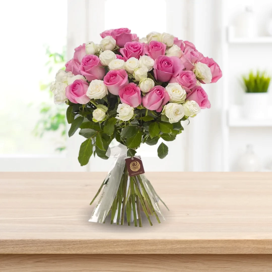 A dreamy combination of soft pink and creamy white roses — a bouquet that whispers pure affection and timeless beauty.