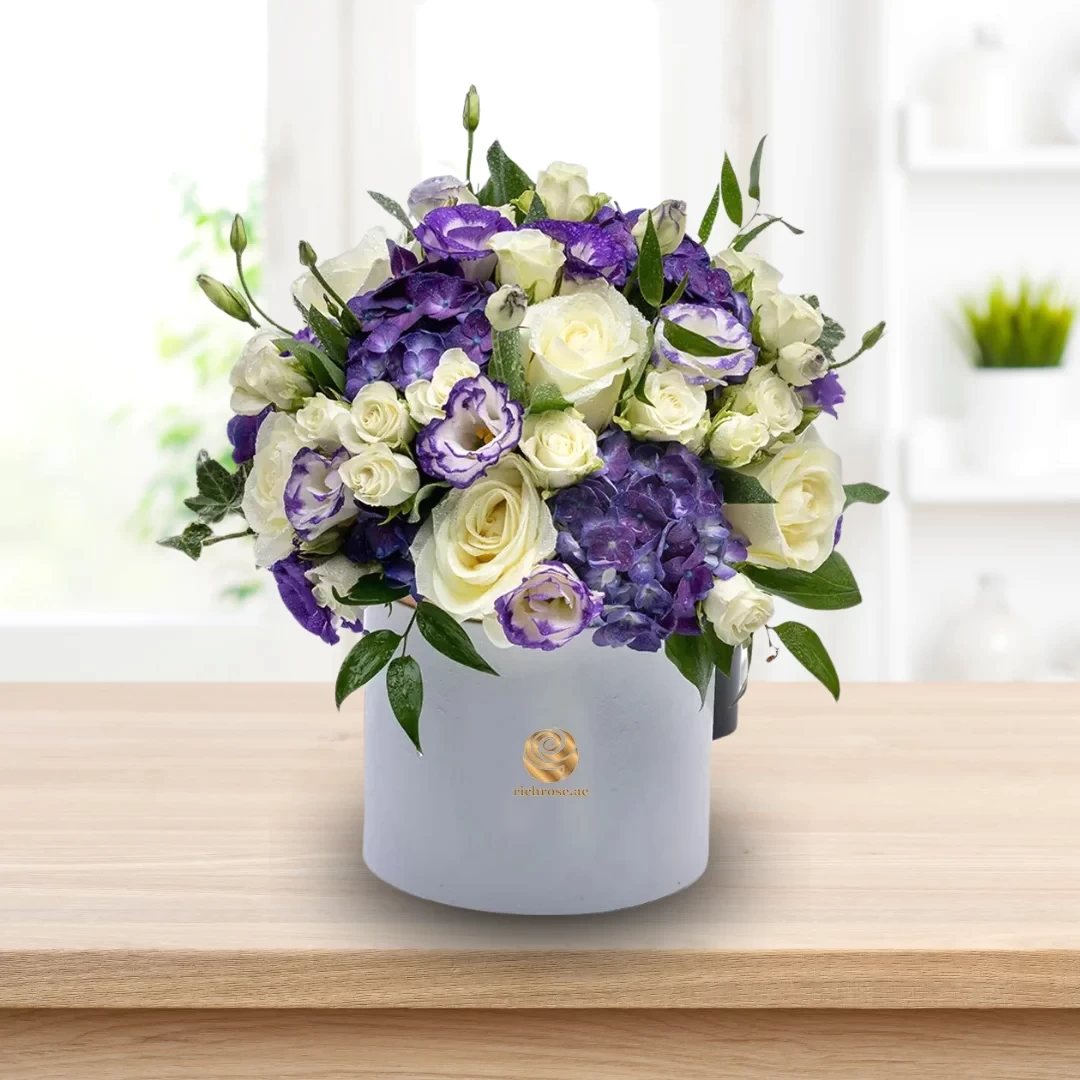 An elegant mix of purple and ivory blooms arranged in a luxurious pastel hatbox. Perfect for expressing love, gratitude, or simply adding beauty to any space. This unique arrangement is available at our flower shop in UAE or through our seamless online flower delivery in UAE.