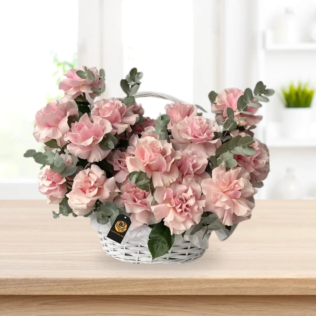Add a touch of elegance to any space with this beautifully arranged basket of lifelike blush pink roses, complemented by delicate greenery. Perfect for home décor, gifts, or special occasions, this handcrafted floral arrangement brings everlasting charm without the need for maintenance.