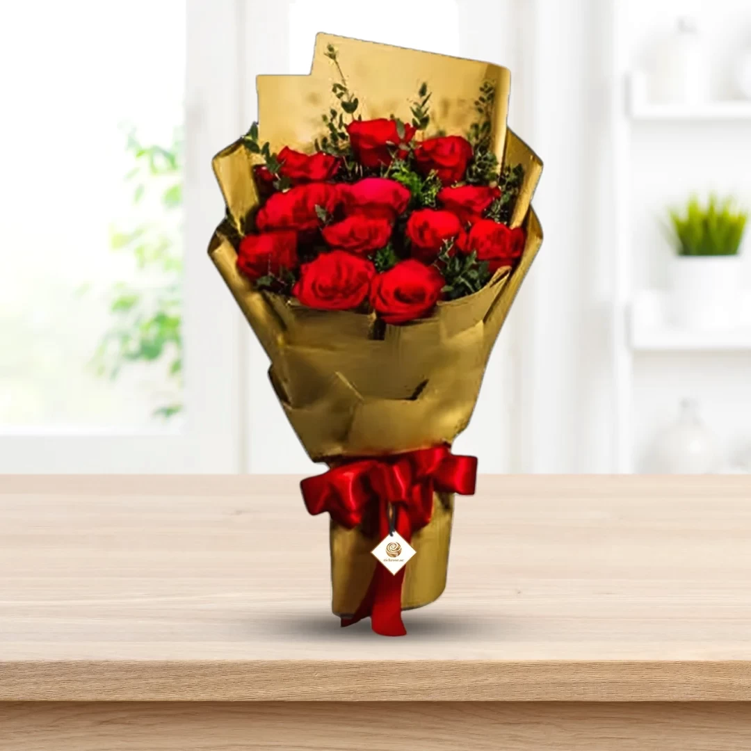 Make a grand impression with this exquisite bouquet of radiant red roses, wrapped in luxurious gold paper and tied with a rich red satin ribbon. Perfect for romantic gestures, celebrations, or special occasions, this bouquet symbolizes love, passion, and sophistication.