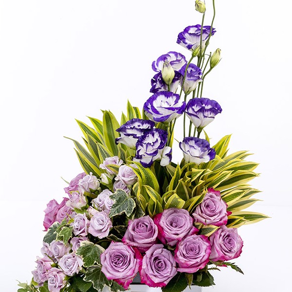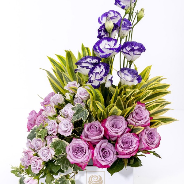 Delight in this artistic floral creation featuring elegant purple lisianthus, lush green foliage, and delicate pink roses—expertly arranged in a modern hat box. Order from our flower shop in UAE or enjoy quick online flower delivery in UAE for a hassle-free gifting experience.