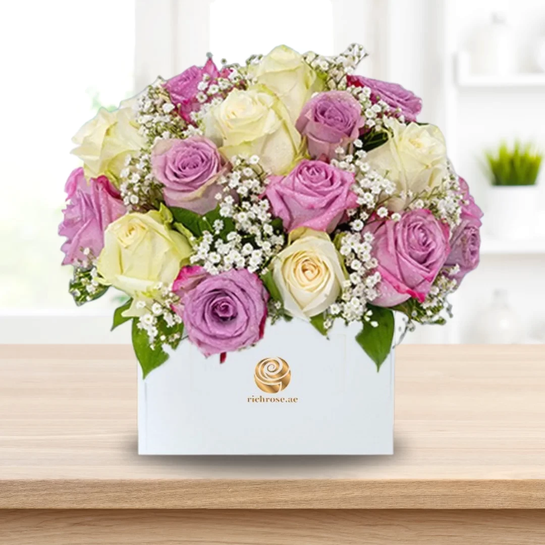 Graceful and elegant, this charming box features a harmonious blend of soft lavender, blush pink, and creamy white roses, accented with delicate baby’s breath. A delightful floral gift perfect for anniversaries, get-well wishes, or heartfelt gestures. Available via online flower delivery in UAE or from our flower shop in UAE.
