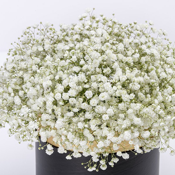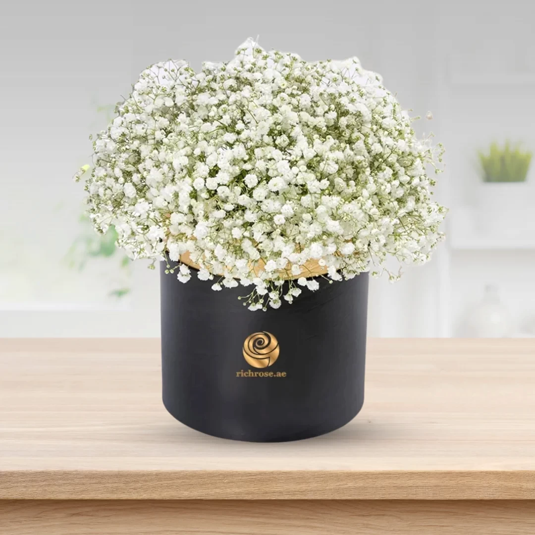 Delicate and dreamy, this lush arrangement of pure white Baby's Breath blooms is elegantly presented in a sleek black velvet hat box. A symbol of everlasting love and purity, this bouquet adds a touch of timeless charm and softness to any space. Perfect for anniversaries, new beginnings, or simply to show you care. Available via online flower delivery in UAE or from our flower shop in UAE.