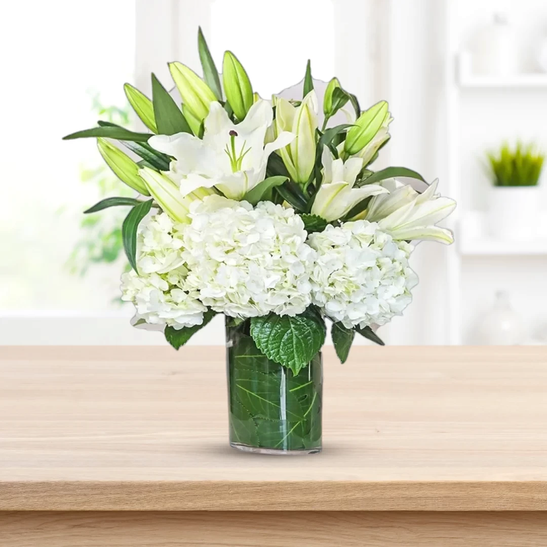 Graceful lilies & hydrangeas in a half-side arrangement- fresh & elegant. Order now from our flower shop with online flower delivery in Dubai & Sharjah.