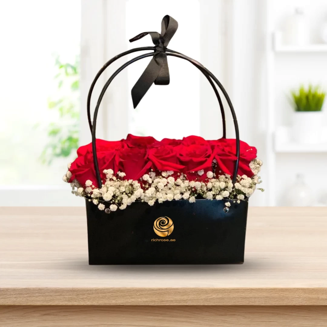 A sophisticated floral handbag featuring vibrant red roses elegantly arranged with delicate baby’s breath. Accentuated with a sleek black handle and ribbon, this stylish arrangement is the perfect gift for romantic occasions, birthdays, or special celebrations.