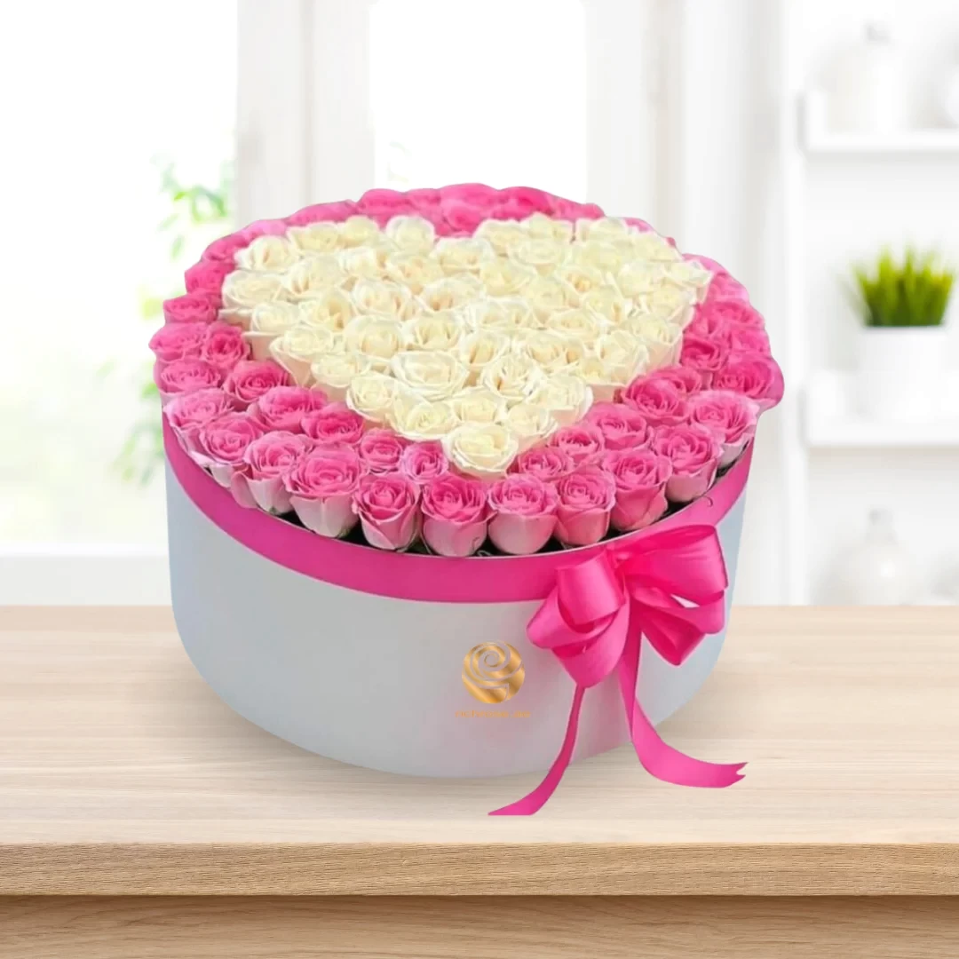 ♦ 50 PINK AND WHITE ROSES IN BOX