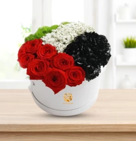Our UAE National Day flower collection includes a variety of floral options, from vibrant flower bouquets in UAE flag colors to chic UAE National Day flower boxes in different shapes like heart, each designed to complement your celebration.