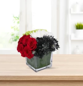 Most often, fresh flowers for the UAE's National Day are sent in four colors, such as red roses, green chrys button flowers, white roses, white lisianthus, white hydrangea, black roses, and more to create the look of UAE National Flag.
